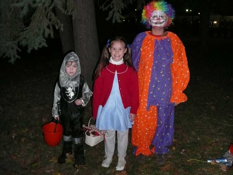 | We didn't go very far trick-or-treating, as we were probably getting towards the end of the 'official' trick-or-treat hours. Alex got tired before we finished, and began asking that someone else carry his bucket. Finally, Lars had to carry him to the car, and I took the girls to a few more houses. But never fear, they got plenty of candy. |